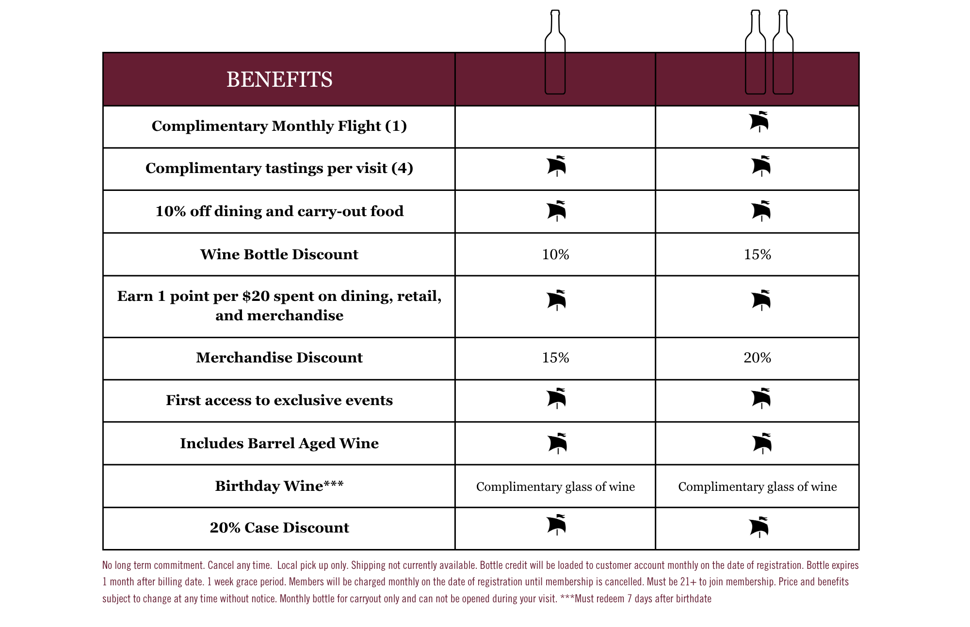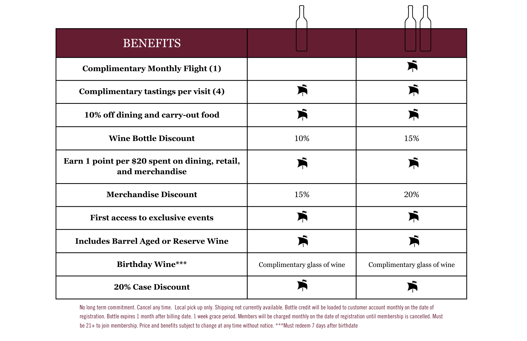 As a Reserve Wine Club Member, you will receive discounts on dine-in and carry-out food and a discount on all merchandise. Discounts vary based on Membership.